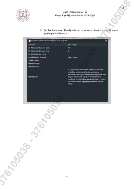 ii. Şartlar butonuna tıklandığında ise kursa kaydolmak için gerekli asgari şartlar görüntülenebilir.
