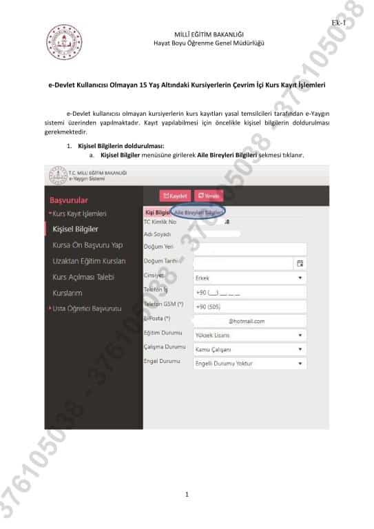 e-Devlet Kullanıcısı olmayan 15 yaş altındaki kursiyerlerin çevrim içi kurs kayıt işlemleri