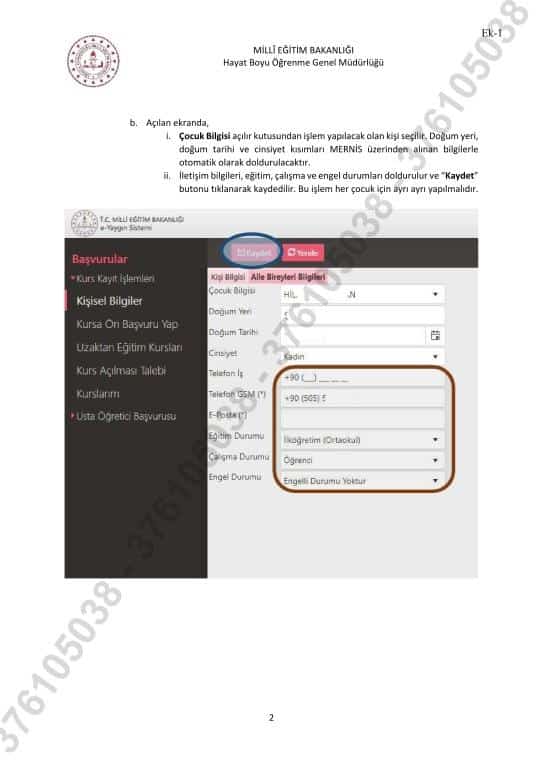 ii. İletişim bilgileri, eğitim, çalışma ve engel durumları doldurulur ve “Kaydet” butonu tıklanarak kaydedilir. Bu işlem her çocuk için ayrı ayrı yapılmalıdır.